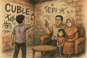 Saat diajak diskusi kolega saya, anggota keluarh kami yang gemar menulis di tembok rumah menyampaikan hal mencegangkan untuk kita renungkan dan menjadi refleksi bersama. 1) kami mencoret coret maka kami ada, kebebasan berekspresi dijamin, efek dan akibat merugikan irreversible atau destruktif, tak perlu dipertimbangkan, yang penting viral sesuai fakta. Toh itu biar menjadi evaluasi, untuk apa peduli, karena bukan tanggung jawab mereka. Toh ada pihak yang mengurus untuk mengecat kembali tembok itu. 2) Maunya dibiarkan untuk mencoret tembok itu tanpa teguran dan sensor demi kebebasan berekspresi. 3) Maunya tanpa ada cubitan apapun bentuknya jika ada kesalahan apapun bentuknya 4) Menolak bekerja sama demi menegakkan independensi dan kendali. Kendali adalah simbol otoritarianisme absolut yang harus dihancurkan. 5) Meminta didampingi tetangga untuk mediasi jika dicubit orang tuanya